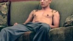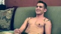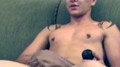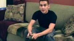 Um jovem rapaz sentado no sofá se masturbando quando seu namorado chega em casa para pegá-lo e se envolve com boquete.