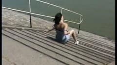 Esta puta jovem está vestindo um vestido curto e decide aproveitar seu tempo na rua para se masturbar em público, o que ela gosta muito...