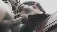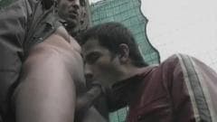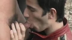 Nesta cena ao ar livre, vemos um jovem sendo chupado e fodido por seu namorado mais velho, que, em seguida, ejacula tudo sobre seus paus.