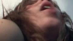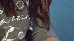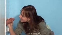 Esta morena sexy Nicole vai ao banheiro e encontra um buraco na parede com um pau fora dela, que ela chupa sem hesitar e até mesmo fode-lo um pouco.