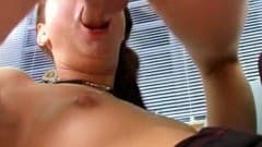Ela coloca a boca em torno deste pau, sugando como uma profissional antes de levar com o pau duro na buceta, terminando com uma ejaculação facial