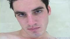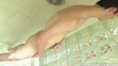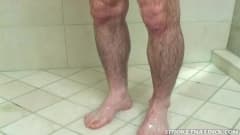 Ele está no chuveiro sozinho hoje, ensaboando, ficando excitado e se masturbar na frente da câmera e e ejaculando em cima de si mesmo