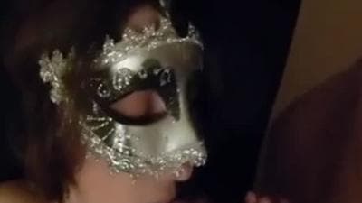 A bela morena está usando uma máscara de penas e se senta numa cadeira para se masturbar com um vibrador enquanto chupa seu namorado.