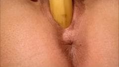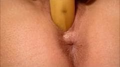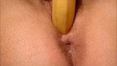Um grande plano de uma mulher francesa numa sessão de masturbação, ela não conseguia encontrar seu vibrador e decide usar uma banana em vez disso!