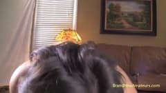 Esta bela morena veio para participar num casting porno e tem que demonstrar que sabe chupar rola perto da câmera.