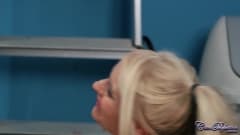 Esta loira peituda está de joelhos para oferecer um bom boquete a esse cara com tesão! Ela chupa até receber uma ejaculação facial!