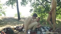 Aqui estão dois jovens na floresta à espera de outro homem para desfrutar de um trio que, você definitivamente não vai querer perder em Boafoda!