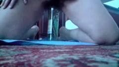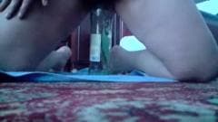 Esta morena gordinha tem uma buceta peluda e hoje ela se masturba de uma maneira incomum usando uma garrafa de vidro, um pepino e um relógio!