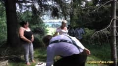 Essas mulheres estão no meio da floresta brincando uma com a outra enquanto um grupo de homens gostam de vê-las antes de se envolver.