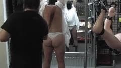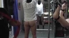 No ginásio, vemos este homem sendo punido por um amigo enquanto está amarrado, sem calças. Ele tem uma forma diferente de desfrutar.
