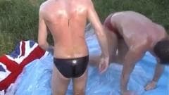 Gostamos de ver esses dois rapazes gays no meio de um campo cobertos em óleo de bebê, lutando de forma emocionante e ficando excitados!