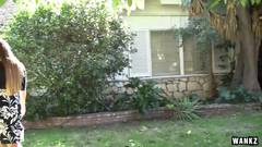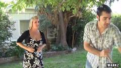 Ela está em casa e anda com vontade de fazer sexo e então como só tem o jardineiro a mão ela vai chupa-lo e divertir-se imenso com as suas bolas.