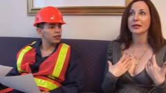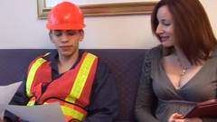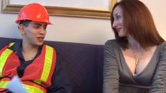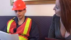 Esta mulher quer transa com um homem que esta fazendo trabalhos de construção em casa. Ela transa com ele na cama.