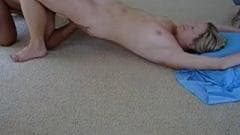 Eles finalmente têm algum tempo sozinho e ela deita-se no chão para ter a cabeça do marido entre as pernas e ele lambe sua buceta para fazê-la se vir.