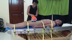 Ele está amarrado a uma cama e não pode se mover enquanto ele está agradado por esses dois caras que se certificam de que ele sente prazer com isso!