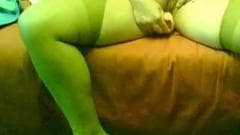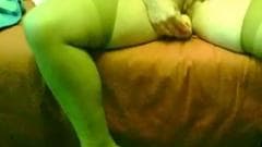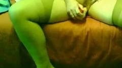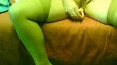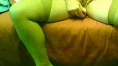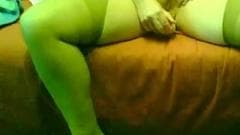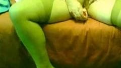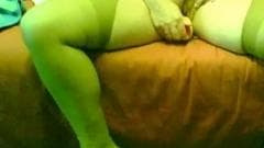 Ela está sozinha em sua cama de collants enquanto fode a buceta dela com um vibrador, podemos ver tudo aqui e nós amamos isso.