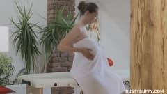 Lucy Wilde espera o massagista mas enquanto espera começa a tocar-se e quando ele chega, vai massajar as enormes mamas da rapariga e fica excitado.