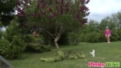 Pinky June é uma puta loira bonita que ama ter sua boceta molhada em frente da câmera e hoje a masturbação vai ser ao ar livre!