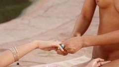 Lésbicas sensuais estendidas na praia vão divertir-se imenso neste vídeo. Que momento de pura diversão ! Um momento sexy a não perder.