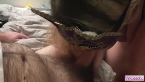 Esta francesa não quer ser reconhecida, pois é muito famosa. É por isso que ela chupa e masturba este cara com uma mascara!