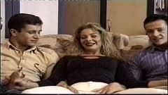 Este vídeo é um vídeo de um trio sexual vintage com uma mulher gostosa que se entrega a dois cara no sofá para ter prazer.
