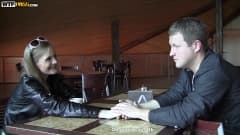 Ela se coloca de joelhos em frente ao seu namorado para lhe dar prazer oral, depois vão para a cama para transar gostoso.