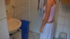 Ela está de joelhos chupando pau como uma puta e ela adora mostrar como ela faz boquete no banheiro em frente a câmera.