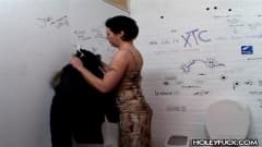 Esta Milf morena pára em um posto de gasolina para fazer xixi e acaba vendo um grande pau saindo de um buraco e ela é rápida em chupar.