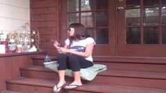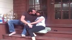 Esta bela morena peituda chupa o pau grande e longo de seu homem antes de jemer de prazer quando ele a fode nas escadas.