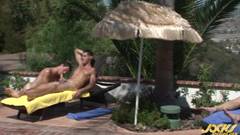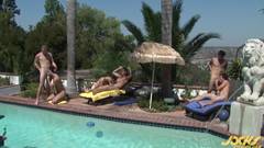 o belo Sebastian Keys aproveita um dia ensolarado na picina para transar com seus companheiros Jeremy Fox, Stefano Ricci, Jake Lyon e Dex Carter.