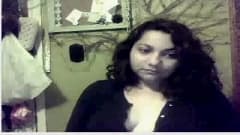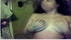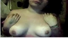 Esta linda e sedutora morena mostra seus peitos grandes na webcam acariciando-se antes de gemer de prazer masturbando sua buceta.