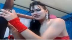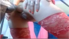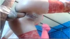 Esta moça vestida apenas com meias sexy e um sutiã vermelho coloca sua bunda em um grande dildo na parede, gemendo de prazer.