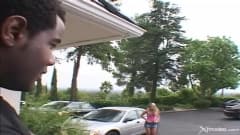 Esta bela loira chupa dois grandes paus pretos bem grossos ao ar livre antes de ser fodida em dupla penetração como ela gosta.