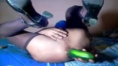 Veja esse cara de collants a enfiar na sua bunda uma grande abobrinha que ele faz entrar e sair enquanto vai gemendo de prazer.