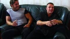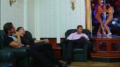 Estes tesudos desfrutam de um show. A loira se contorce nua diante deles. Mas logo eles vão gozar com estas duas moças!