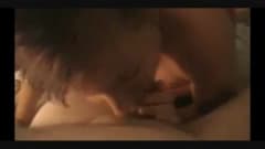 Voce tem uma bela vista das grandes mamas desta Milf que enquanto ela suga a rola de seu homem e ela masturba-o com os pés.