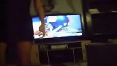 Ela está cansada de o ver na TV. Então ela se coloca em frente dele toda nua e começa a acariciar sua buceta muito molhada.