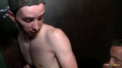 Trent Jackson e Matt Hart ficam excitados um com o outro, com um bom boquete enquanto eles estão em um banheiro público e desfrutando cada minuto dele