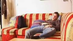 Um jovem toca-se por cima da sua roupa, em seguida, ela masturba com bastante vigor o seu grande pau. Ele finalmente ejacula no final do vídeo!