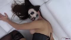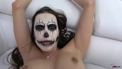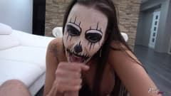 Nesta cena de sexo gravada em POV, voce vai adorar ver esta morena chupando a rola deste cara com sua cara pintada para o halloween