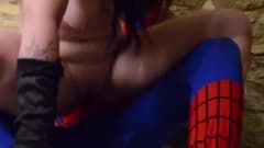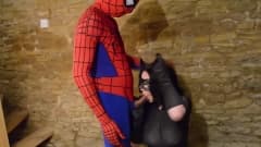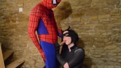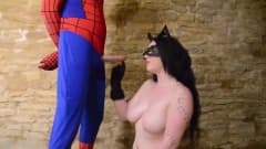 Harmony Reigns está vestida de gata enquanto ela suga o pau de seu amante homem aranha que tem um pau duro!