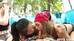 Estas putas gostam de fazer tudo juntas porque elas são melhores amigas e partilham todas as experiências, incluindo sessões de boquete em grupo