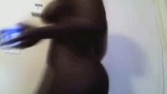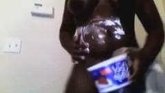 Esta mulher preta gostosa cobre seu corpo quente com creme enquanto dança e se masturba ansiosamente na frente da webcam para excitar-nos!