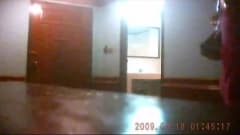 Câmara oculta espiando mulher pelada no banheiro, enquanto esta se seca e se veste após ter tomado banho.