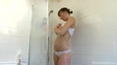 Esta bela morena adora sentir a água escorrendo em seu corpo porque isso a excita e é por isso que ela deve acabar se masturbando
