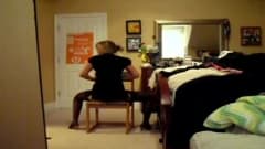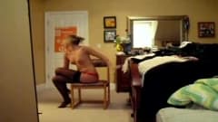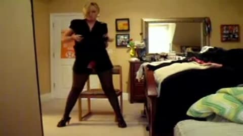 Esta linda loira gosta de dançar e acariciar-se para nós e ela está vestida com suas meias e seus saltos altos na frente da câmera!