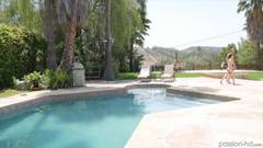 Kristen Scott sai da piscina muito excitada e decide dar prazer a este homem com um boquete muito saboroso. Ela o suga completamente!