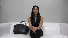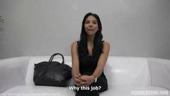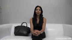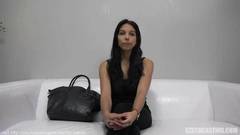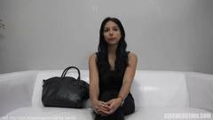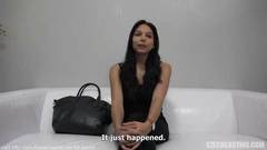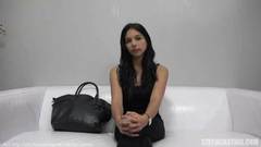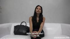 Veja Silvie uma morena Checa de 18 aninhos coberta de óleo, brincando com um vibrador num casting porno antes de mamar e sentar na rola do cara.