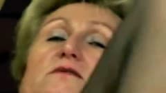 Uma mulher velha e madura se filma e seu bichano peludo. Ela fode com um grande dildo no topo das escadas.