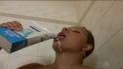Esta morena goza de um ótimo momento quando ela se toca e sente prazer imenso no chuveiro cobrindo-se no leite
